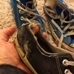 The next pair were blue high tops, I got them junior year in high school, see how loved they are? blue and red tracing on the trim, holes you can’t see and a flower I stitched. I still wear them on occasion.
