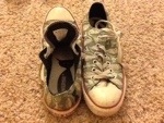 Next pair I got in college were maroon low top, I wore these for everything in college, including doing carpentry work for the theater. There is paint and glue and sawdust, the dark spots are glue, water and brown paint mixed together for the set of Man of La Mancha. I actually wore then last night when we were throwing clay, can’t get my others coved in clay!