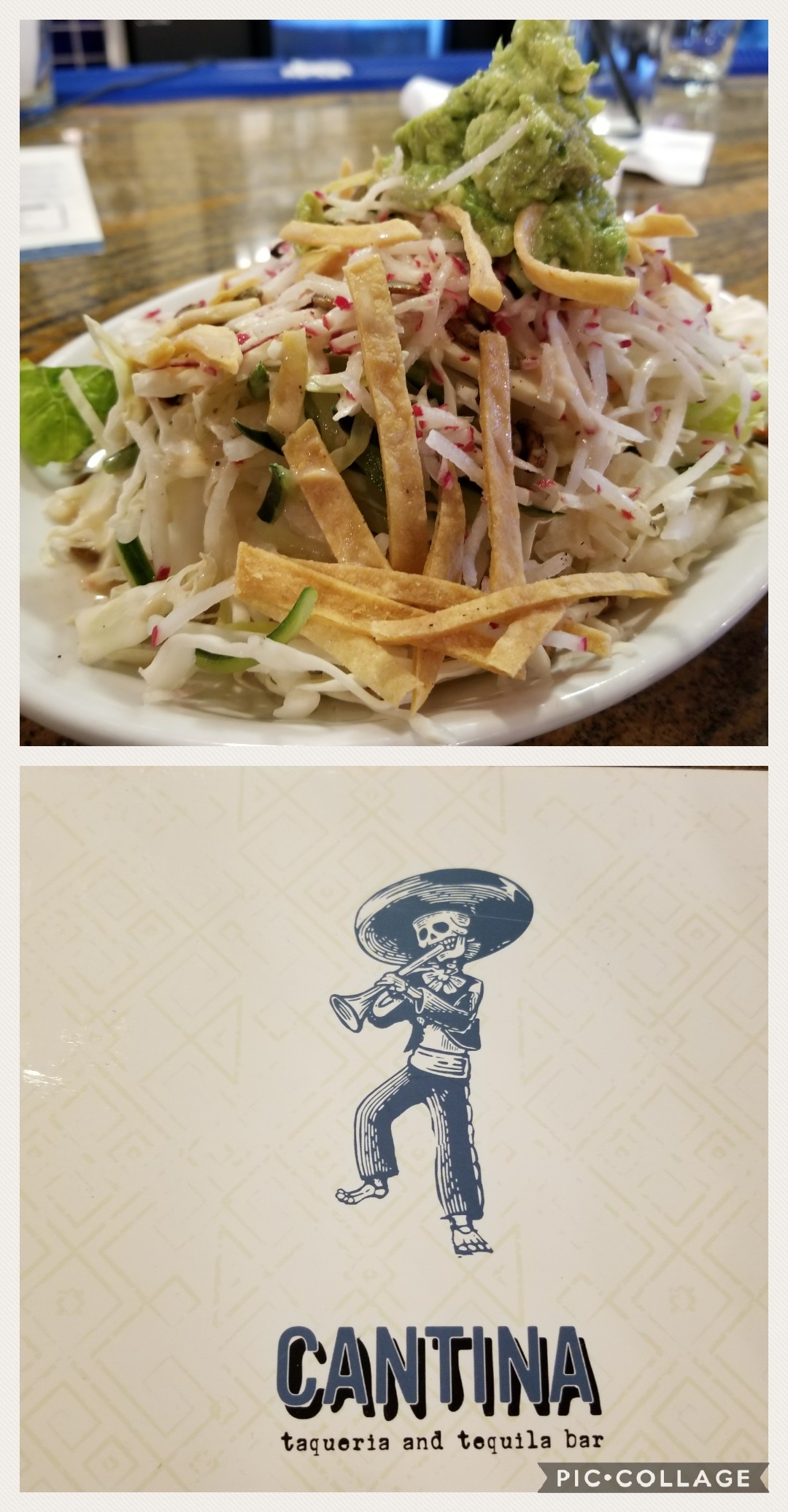 At the airport I went to Cantina Taqueria and Bar to get some food and had a good salad that had lettuce, jicama, which is a root vegetable, avocado, cucumbers, pepitas, cabbage with a tamarind dressing.