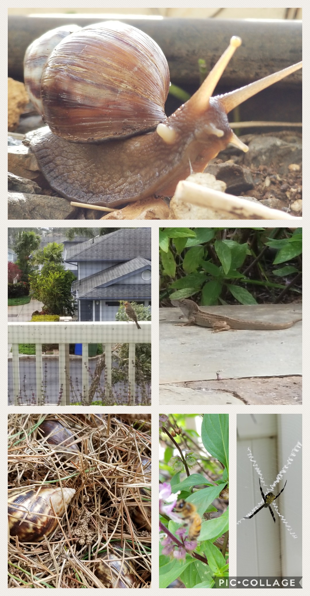 So, snails, slugs and spiders, oh my! check out his coloring! The bees are having a grand time on the basil bushes. You have to be quick to catch a gecko! The birds too, if you move or make a noise, they’re gone!