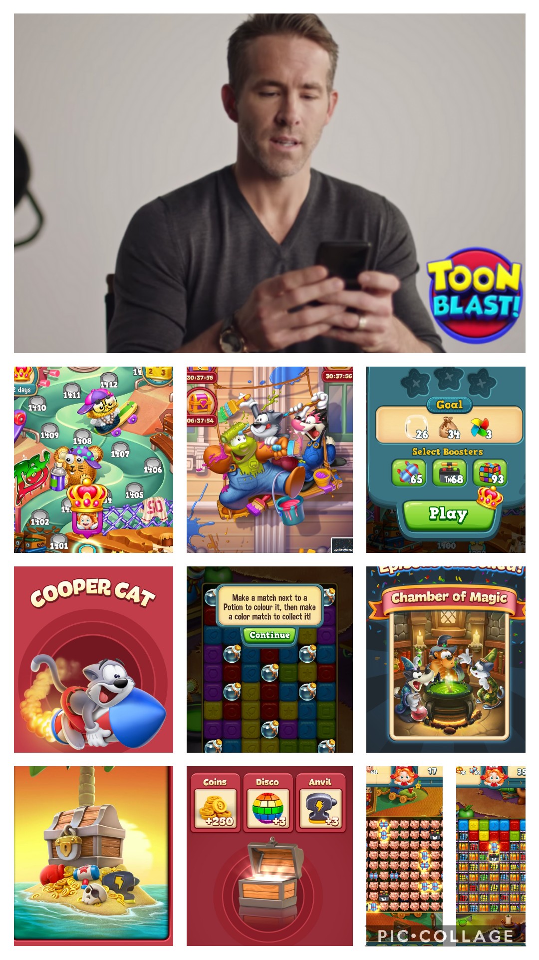 One of the things with pc games, even when you play on your phone, unless you pay to not have ads, there are ads, great…commercials on my phone while I’m playing a game. Normally, I don’t watch them, I find they get in the way, but about 4 years ago, one caught my eye…and that brings us to my post. This was an ad with Ryan Reynolds for Toon Blast and I was hooked at the first Toon Blast commercial! I found and watched them all! I think my favorite is still the one when he gets a tattoo of the last level he made!