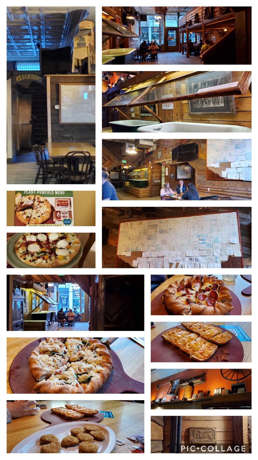 The atmosphere is rustic and western, high ceilings, wooden posts or tree trunks in the middle of the restaurant, exposed beams, very old west feel. Best part, for me anyway…they have a plant based menu! We had vegan chicken bites and then I had the Dude Ranch, a plant based pizza with chick’n, bac’n, bits, spinache, Italian seasoning, non-dairy cheeses and vegan ranch dressing. The crust was a bit thick, but overall, the pizza was really good. I had two whole pieces, out of the eight, guess what’s for lunch or dinner tomorrow! Hey, maybe even breakfast, ya never know!