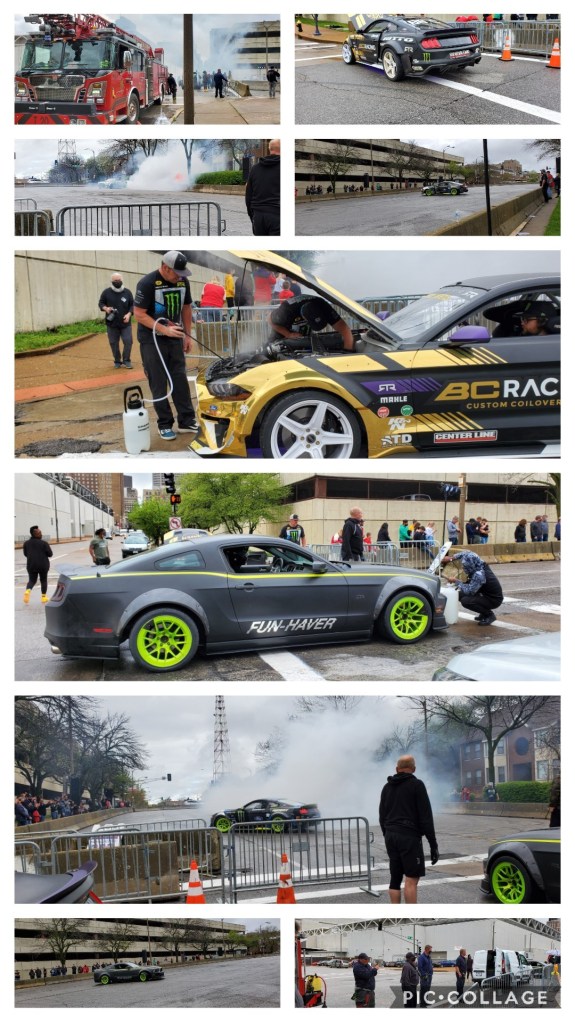 As we were looking for a place to park, we could see smoke, hear the tires squealing and screeching, and smell burning rubber…we found it! We headed towards the crowd and could see, smell, and hear much better! The street was blocked off and it was the Drifting with Vaughn Gittin Jr., Chelsea DeNofa & Mystery Driver. I honestly don’t know who we saw, it was loud and I missed what the announcer said. It was a lot of fun to watch, the smell was awful, who likes the smell of burning rubber?! but the action was great! I sent this video to my dad with the subject: “This was not me!” For anyone that knows me, I have always had a lead foot and I have gotten so much better, but I knew my dad would appreciate it!