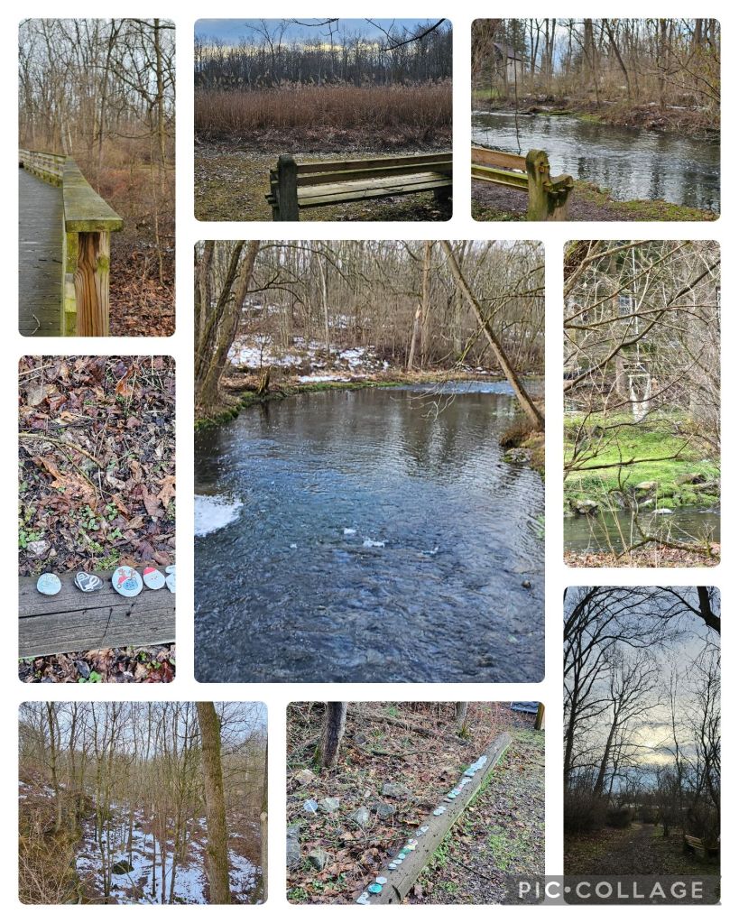 So…I practiced some French, brushed my teeth, I thought that was a good thing to do, got dressed, all about the time PSM had let the dogs out. Do not tell me you didn’t see that coming! HA HA. We decided to go to a different park, well, different from the one near us that we usually take them to, today we went to the park in Annville, Quittie Creek Nature Park, we were there on January 20th, fresh snow covered the path and the trees, oh my! Just look at the pics! Today, there was very little snow on the ground and it was damp and a bit muddy, but the girls still had a good time and we walked on and off the beaten path. Most of the people at the park were fisher persons, we chatted with some of them, they were fishing for or hoping to fish for trout. I used to love trout, rainbow trout more than the others.
