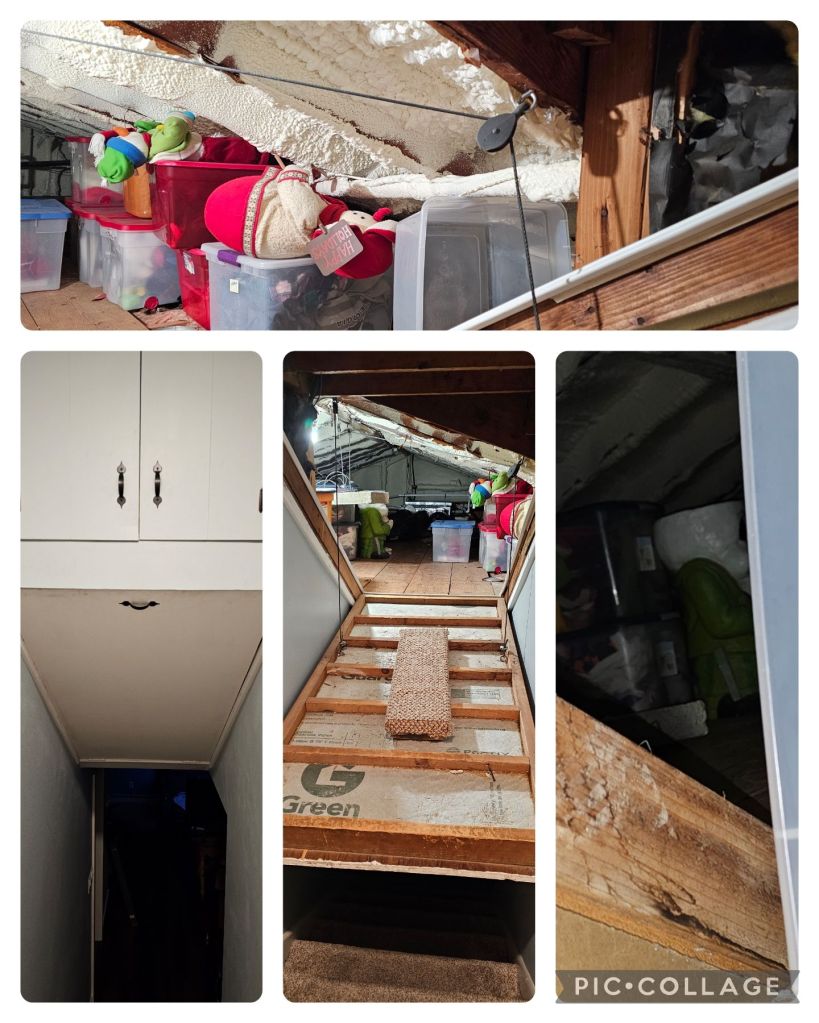 You access it through a door that you pull down in the hallway and when you pull it down, those you can see into the space. It’s not big enough to walk around, but it’s not a crawl space! The door has wooden rungs or steps you walk up to get into the attic.