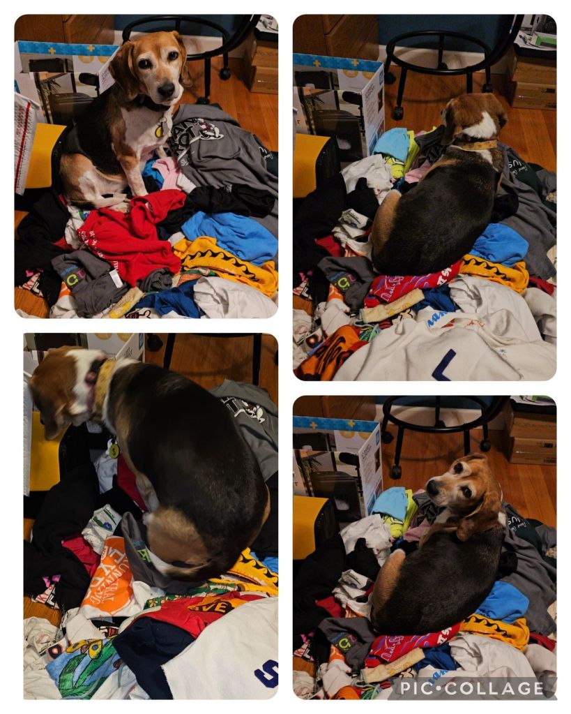 Even better…meanwhile…as I’m doing something, I turn around and what do I see, but Bee doing her circles to make herself comfortable in the new pile of t-shirts that she must think is another bed. She does that when she gets on the bed, circles it, I don’t know, 50 times, and then settles in for a nap. Just look at her!