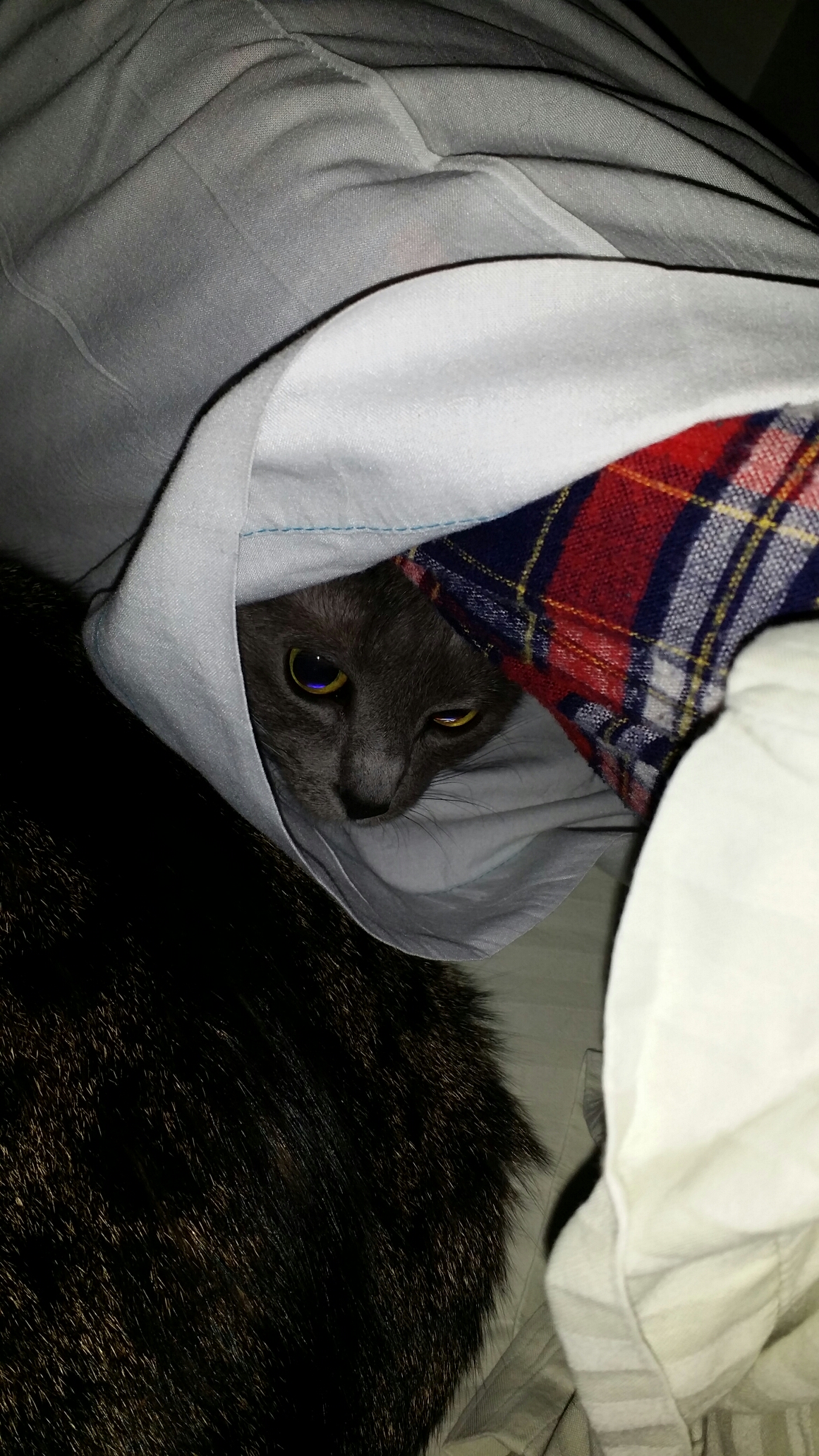 If you have cats…do they like to help you make the bed? Get under the sheets and burrow and then freak out when they think they are trapped? (Look where Peanut is)