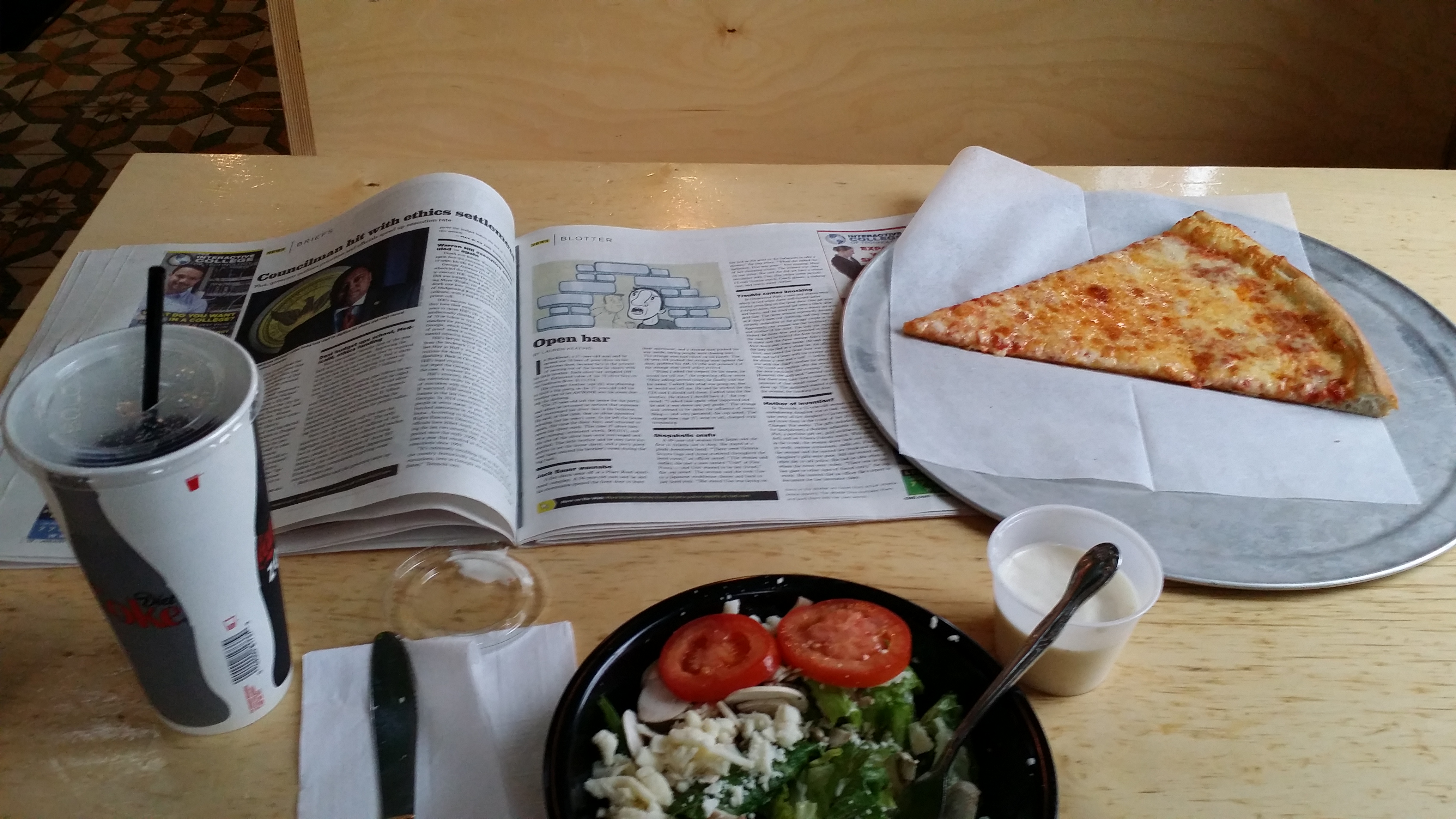That being said…I decided to do something stupid [for my digestive system]. I thought about it and said “the hell with it!’ I stopped at Fellini’s and had…a slice, salad and soda and creative loafing… ah… so good… and so bad.