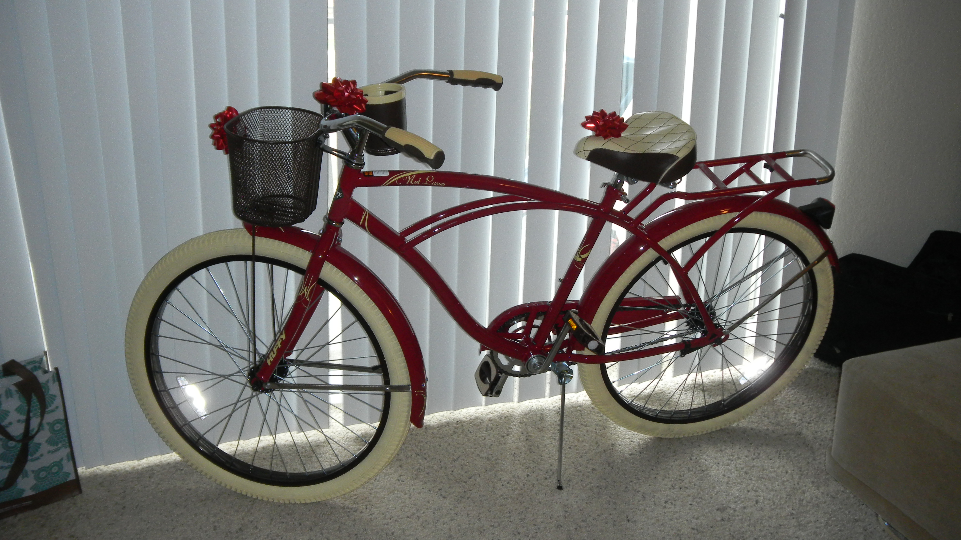 Next…I was told to sit on the couch and close my eyes and then…I got my birthday present from DCM!!! It was a brand new gorgeous red Huffy Bike! A beach comber like I wanted! The red is like a radio flyer wagon! It has a basket and a “luggage rack” which extends, I can bring a bunch of stuff home. Can you tell I’m excited???