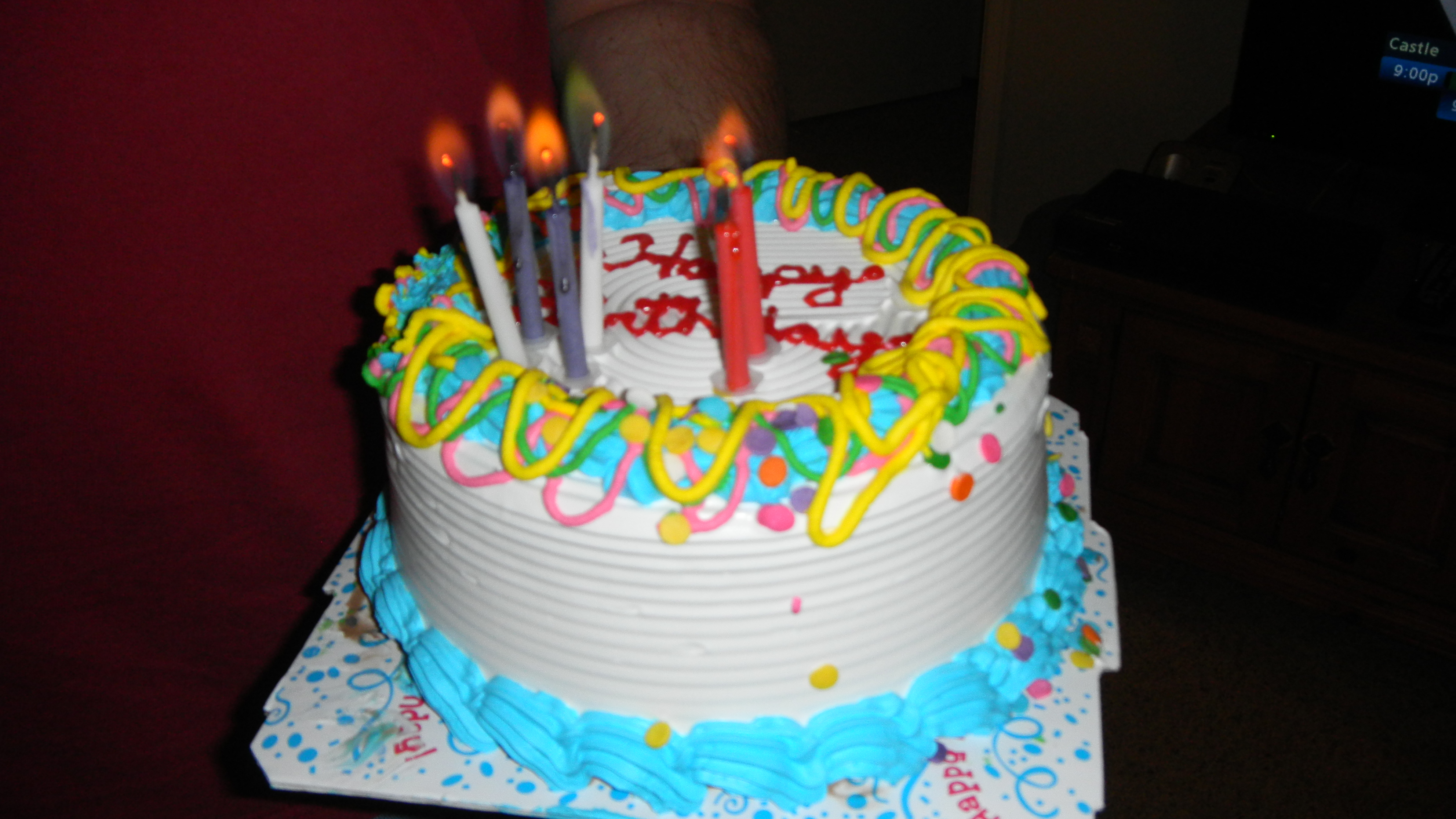 Somewhere in the middle of all my thank you’s, it was time for cake! I said “is it time?” “Yes!” I turned off the light and around the corner came a Carvel Cake!!! A tradition in our house growing up in the summer, we would get a Carvel ice cream cake, top is vanilla and the bottom is chocolate and the middle has chocolate crunchies. [neither one of us care for chocolate ice cream, so we both had the top!] The candles had prism color flames! http://www.carvel.com/