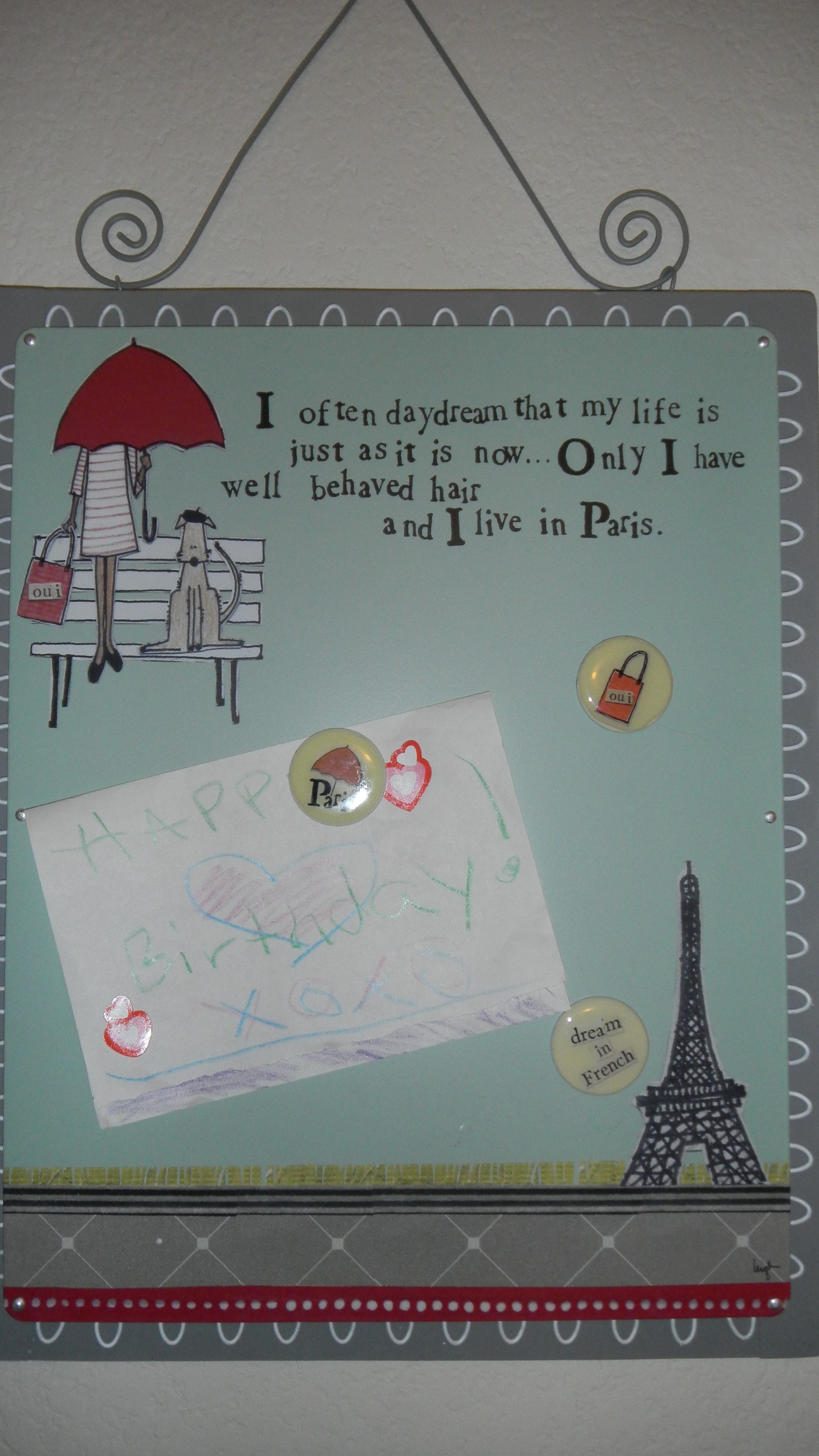 Got a text and email from SDL, did I get the package from her and Miss A? FedEx said it was delivered and signed for by Brown, who’s Brown? DCM went down to the office to check and when I opened the package…LA LA LA LOVE! A charming metal photo board that says “I often daydream that my life is just as it is now…Only I have well behaved hair and I live in Paris”, is that me or what?