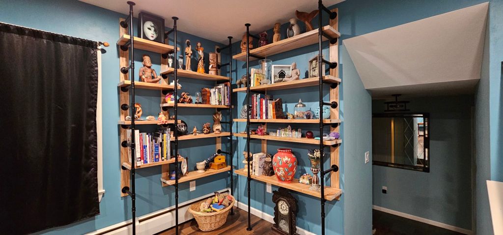 He did an amazing job! The shelves are mounted on industrial piping, and I just bought industrial piping curtain rods, please ignore what’s there right now! I can’t tell you how many coats he put on the boards, I lost count! JM and I worked on the design, back and forth on some things and the end result is fabulous!
