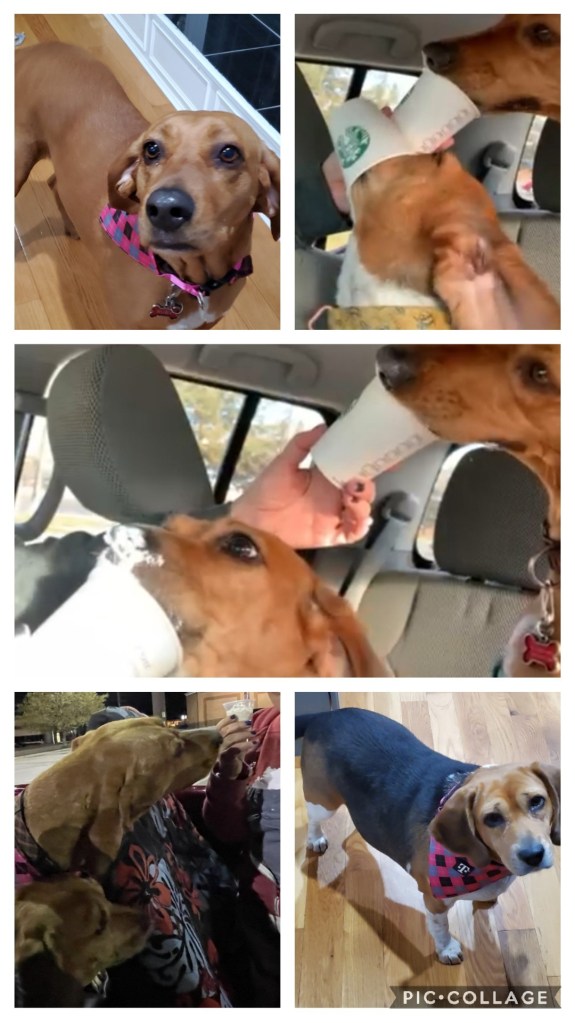 So…April 13th is our Gotcha Day. We celebrated by going to Starbucks for two pup cups, which they la la la love! They are about dixie cups sized cups of nothing but whipped creme and they go crazy for them! We don’t give them anything but dog food, dog treats and veggies [yes I said veggies!] for the goodies, and every once in a while…pup cups. We take them in the convertible with the top down and they are happy as can be! And… they know where we are and what’s coming!