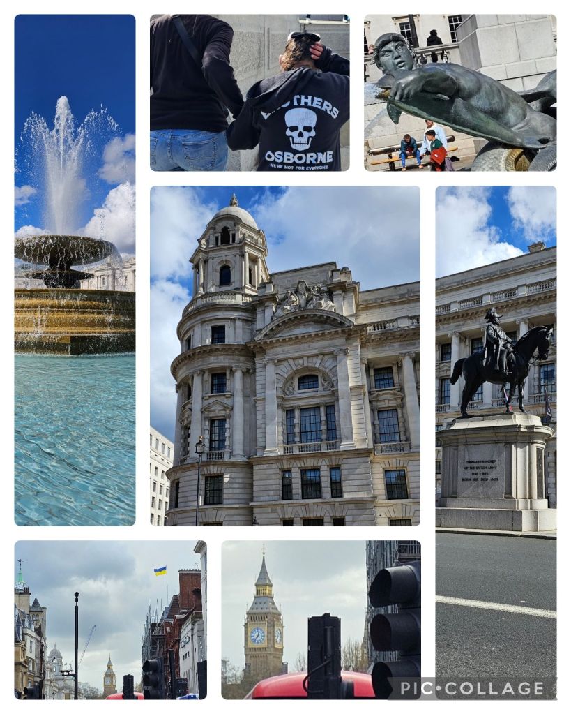 After the pictures and me squealing about the royal horse putting his head on my shoulder, you are welcome for the ear worm! We walked to Trafalgar Square, it was right up the street. It wasn’t overly crowded, unusual, but nice. The fountain was doing it’s thing, people were walking around, climbing on things they weren’t supposed to, oh well, and the traffic was going by as if nothing would stop it.
