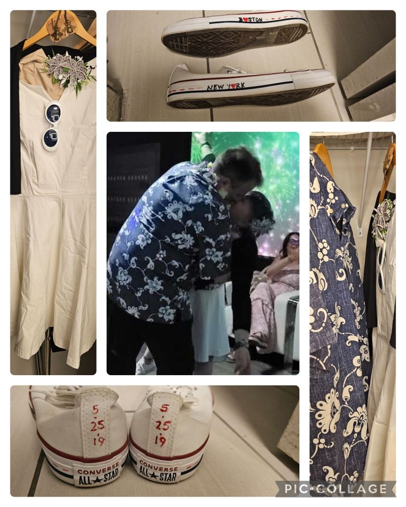 We even wore the same outfits, ignore the wrinkles, I took the pics right after we hung up our stuff! We had Chuck Taylor, Converse Allstars, that I had painted Boston…New York…and the date on both pairs. PSM wore the same formal Hawai’ian Shirt, I wore the same rockabilly dress with tulle under it, same flowers in my hair and we were good to go!